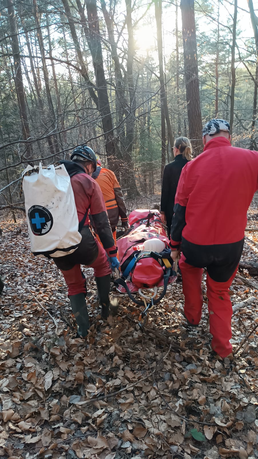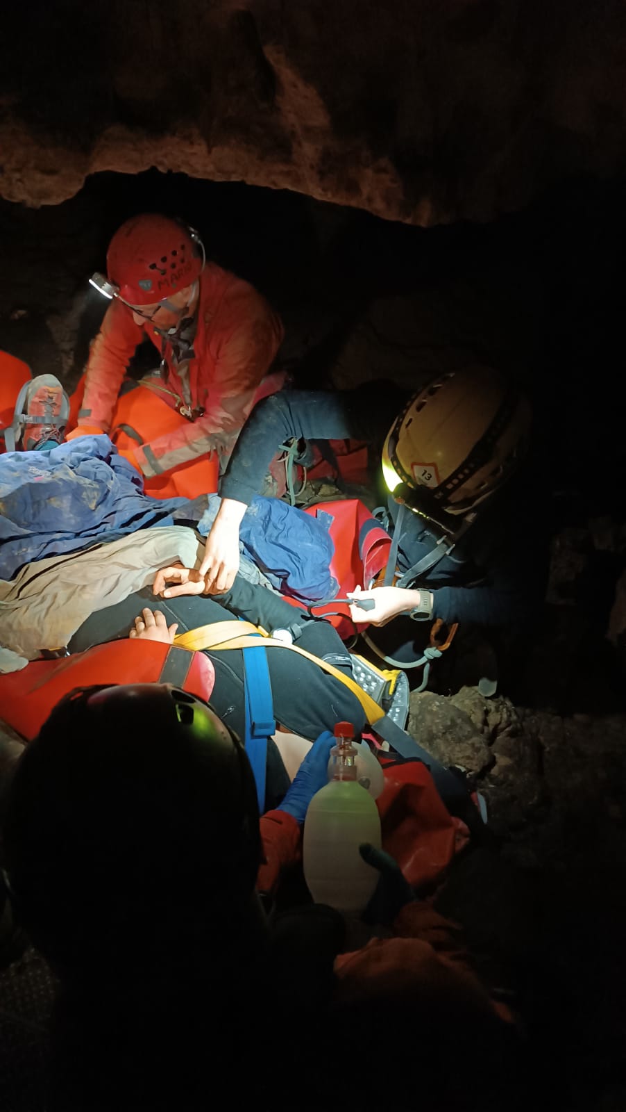 Pierwszy żywy poszkodowany został odnaleziony jako osoba zagubiona w jaskini. Był splątany, wychudzony, bez widocznych obrażeń. Wdrożono zabezpieczenie termiczne, podano płyny oraz leczenie objawowe. W dalszej części działań poszerzono postępowanie o dożylne podanie płynów, cewnikowanie i monitorowanie diurezy. Był to scenariusz wymagający przede wszystkim oceny ogólnego stanu pacjenta, myślenia o wychłodzeniu, odwodnieniu i długotrwałym przebywaniu w trudnym środowisku.
